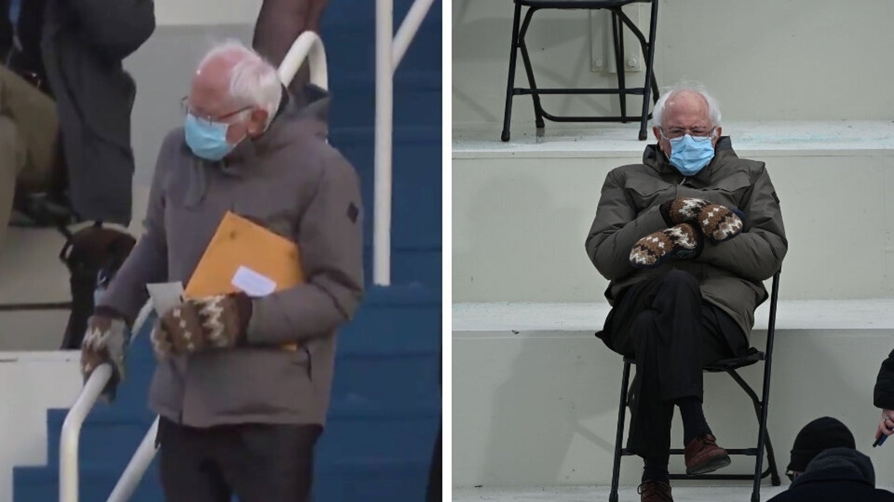 Bernie Arrives At Inauguration Carrying What Can Only Be A Copy Of The Plan In His Manila Envelope Bernie Sanders Wearing Mittens Sitting In A Chair Know Your Meme